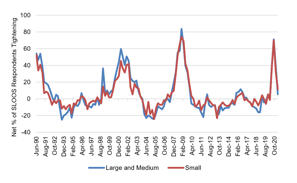 The pandemic has clearly narrowed bank lending and opened the door to private debt. Net tightening of bank credit to commercial and industrial borrowers, according to the Fed’s Senior Loan Officer Opinion Survey, has been significant since last March. At its peak in the third quarter last year, more than 70% of banks had tightened terms to small, medium and large C&I borrowers. The Fed reports no net easing yet. But, if history is a guide, the bank lending cycle has not played out.