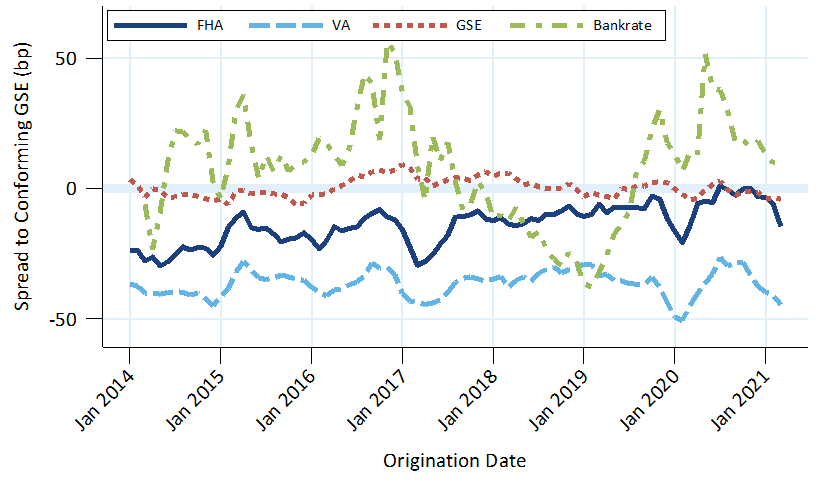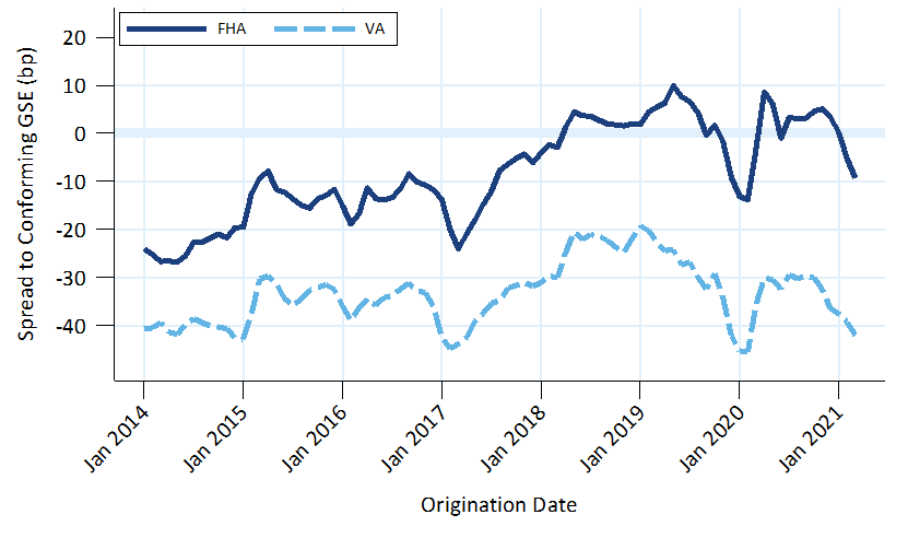 FHA rates are typically higher than VA rates, even though they can be sold into the same MBS security. Lenders often place credit overlays on FHA borrowers, reflecting higher FHA default rates; lenders face some costs when loans default. Both FHA and VA rates increased relative to conventional rates after 2017 and the spread between FHA and conventional mortgages was typically within ±10 bp.