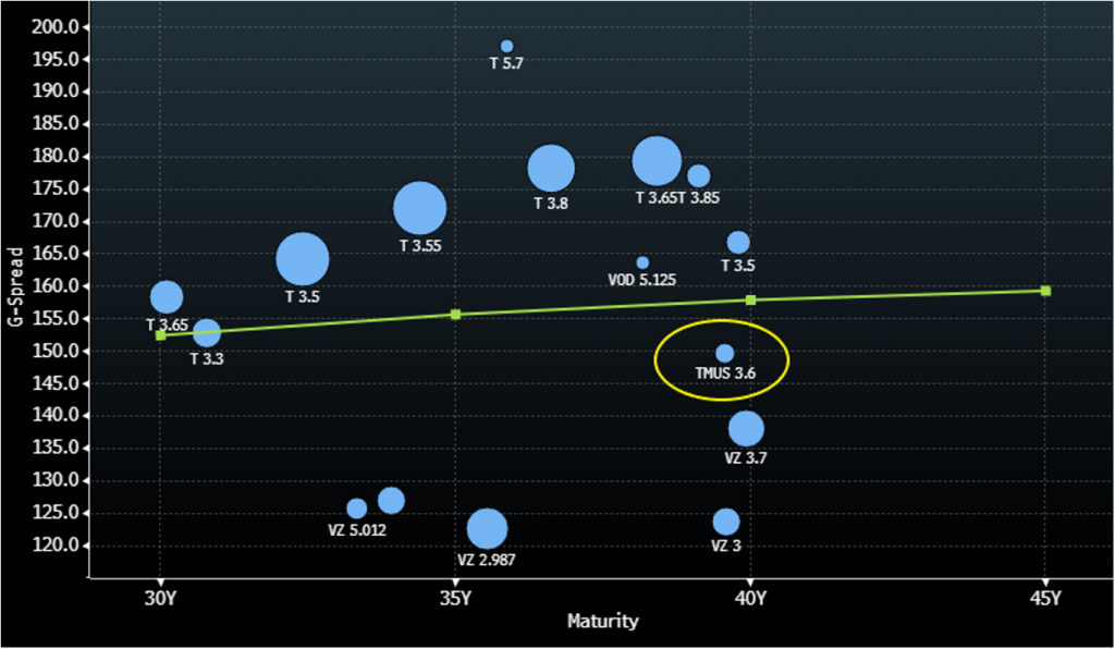T-Mobile US Inc (TMUS) has the ability to outperform investment grade peers as the company is targeting net leverage of mid-2.0x by year-end 2022. The C-Band spectrum auction saw both Verizon Communications (VZ) and AT&T Corp. (T) aggressively spend, pushing out leverage reduction by a couple of years, while estimates are that TMUS’ net leverage will be below that of VZ and T by the end of 2022. TMUS management anticipates unsecured ratings will be upgraded to investment grade sometime in 2023. Over that time, TMUS spreads could outperform peers as it remains in debt reduction mode. Synergy capture from the Sprint merger recently increased, pushing EBITDA higher at a faster rate and lowering leverage. Investors looking for both yield and duration should consider TMUS 3.6% 2061 bonds, which could collapse closer to VZ.