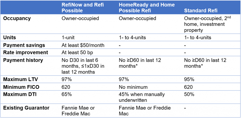 Other than the increased debt-to-income limit, eligibility for RefiNow and Refi Possible are more restrictive than HomeReady/Home Possible and standard refinances. The below table gives a brief overview of the eligibility differences between the refinance programs: