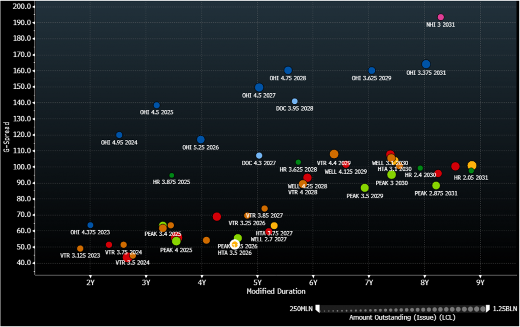 Exhibit 1. HTA vs Healthcare REITs – Although spreads are optically tight, HTA presents a defensive opportunity amidst a challenged landscape for the broader REIT sector