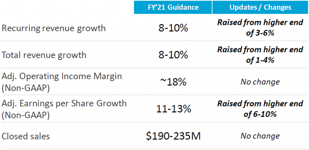 Given the better-than-expected results year-to-date, BR substantially increased its guidance for the year (Exhibit 3). While the new guidance reflects the impact from the Itiviti acquisition, the bulk of the revised guidance stems from the strong organic growth. Full year recurring revenue growth is now expected to be in the 8%-10% range, up from previous guidance of 3%-6% (management had expected results to come in at the high end of the range). Additionally, total revenue growth was raised to the 8%-10% range, which was up from initial guidance in the 1%-4% range. Management left its adjusted operating income margin at roughly 18%, which would translate to a 50 bp increase from fiscal year 2020. Management also increased its adjusted EPS guidance to the 11%-13% range (up from 6%-10%).