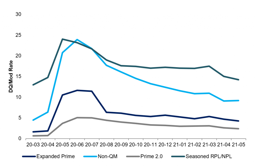 After a healthy decline in delinquencies across most sectors of mortgage credit in April, the trend flattened in May, possibly signaling a tail of borrowers coming out of pandemic with persistent financial hardships. While conventional wisdom suggests better credits cure and weaker credits remain, that does not appear to be the case to date. Strong underwriting, robust housing and consumer fundamentals continue to support the remaining loans. Modification and extension look more likely than liquidation and loss.