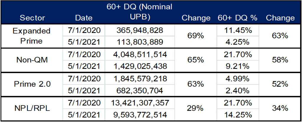Despite meaningful declines in delinquencies across all sectors, the differences credit metrics across populations of delinquent loans were generally small.  Declines in average FICOs on May delinquencies versus those observed in July of last year were five to ten points across sectors while LTVs on delinquent loans remained fairly static. Loan WACs and borrowers’ debt-to-income were consistent as well. Some sectors saw a modest decline in the amount of delinquent non-owner occupied loans between July of last year and May.