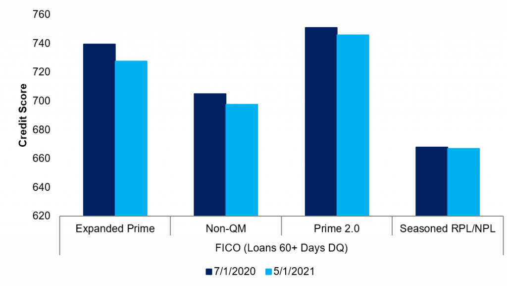 Delinquency rates across most sectors of mortgage credit peaked last July and have broadly declined since (Exhibit 1). The drop in April was especially notable, coming a year after many forbearance programs began. A comparison of attributes of delinquent borrowers at the July peak to those in last month’s remittance cycle shows that, by and large, those attributes have remained fairly consistent. That suggests as the population of delinquent borrowers decreases, the decrease may not be driven by better borrowers re-performing and worse credits remaining delinquent or in forbearance. While the findings are not uniform, the trend seems to hold across major exposures to mortgage credit.