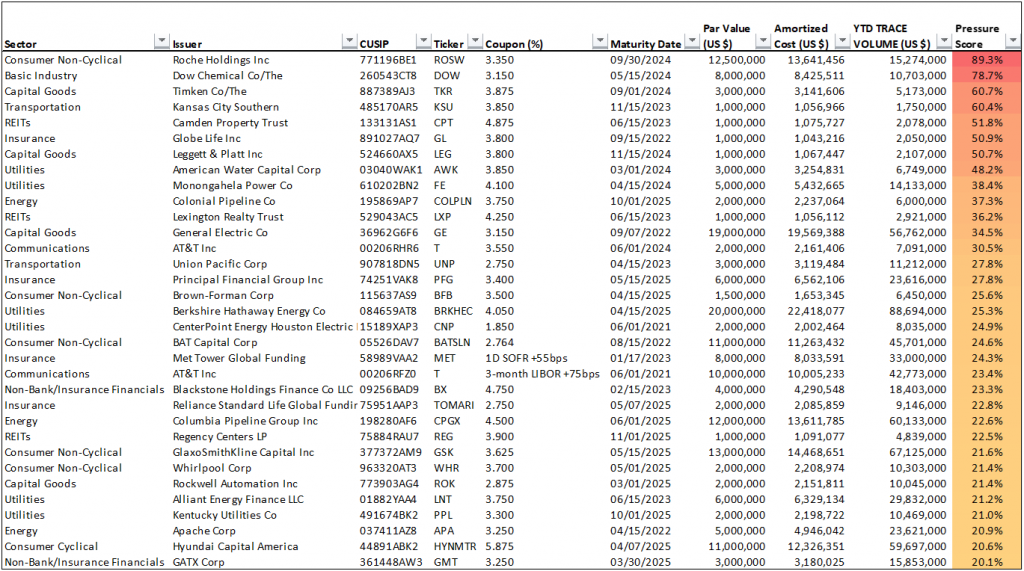 One way to measure potential selling pressure is to look at the size of the Fed’s current holdings at amortized cost as a percentage of total TRACE trading volume in that individual security year-to-date. This gives a Pressure Score for each individual CUSIP, and it serves as a proxy for the relative difficulty the Fed may have in liquidating each position without having a significantly negative impact on secondary pricing. By targeting securities with the highest Pressure Scores for sale in swap (or selling short), an investor could anticipate the individual issues in the SMCCF most likely to widen on Fed selling. The investor could redeploy proceeds into securities with much lower Pressure Scores that have the market liquidity to withstand the technical pressure of the Fed’s eventual selling.
