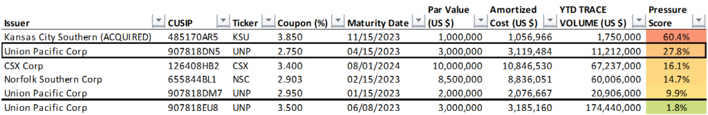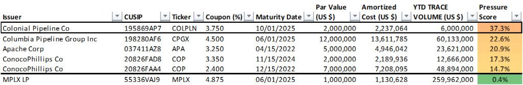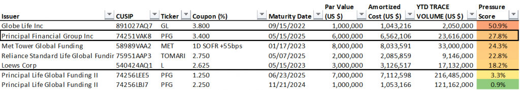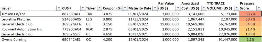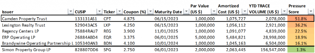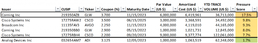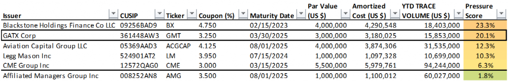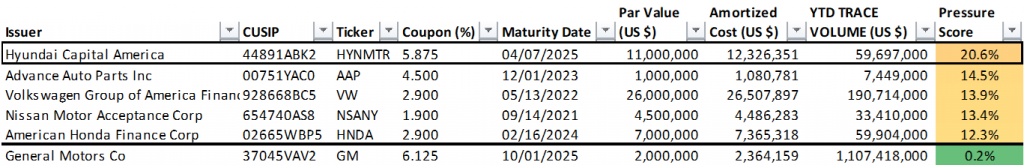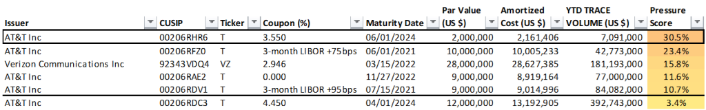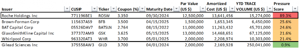 The Fed holds 33 individual positions with a par value of $184 million in corporate bonds with a Pressure Score of 20% or greater (Exhibit 1). Each of these issues exceed 20% of collective TRACE trading volume in the issue year-to-date. The full list of Fed holdings and respective Pressure Scores is available on request.