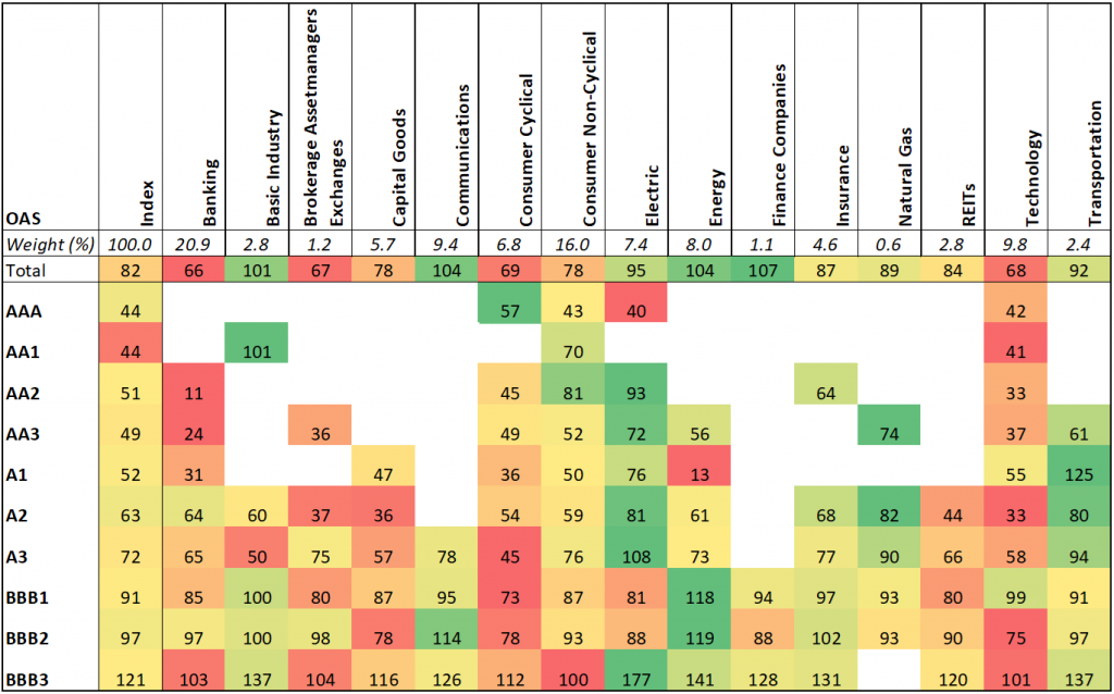The current aggregate spread levels (OAS) vary across each ratings category for the entire IG index available in each individual sector (Exhibit 2). The blanks represent the ratings categories not currently represented in each of the sectors on the chart. Green demonstrates the higher spreads available at each of the individual rating categories, while red depicts the lowest.