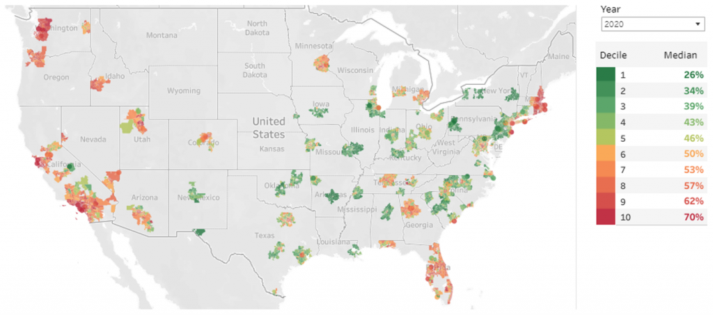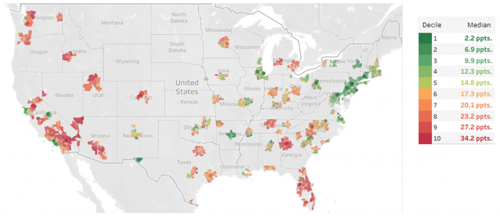 One takeaway from the study is that single-family rental operators and build-to-rent ventures that have concentrated operations in areas where the land share of home prices is high but has been relatively stable for many years may have less volatile portfolios than those who have concentrated holdings in areas that have experienced large run ups in land share since 2012 (Exhibit 2). From that perspective, home price risk in much of the Northeast Corridor, for example, is very low. Even though the land share in 2020 is quite high in many areas, it has remained relatively stable over the past eight years. Another example of an area with low home price risk is around Little Rock, Arkansas, where the land share is a more moderate 20% to 25% on average and has stayed at those levels for years.
