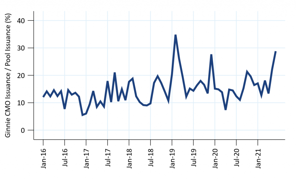 Since the start of the pandemic, Ginnie Mae has been a smaller component of new MBS pool issuance. There are a few reasons for this. FHA loans refinance at a slower pace than conventional loans, lowering Ginnie Mae’s share in a refinance wave. This effect has been greater during the pandemic since many FHA loans used forbearance, which also blocked a refinance. And last summer many banks bought out nearly all their delinquent loans, but many of those loans may still be delinquent and ineligible for re-pooling. As a result, the share of new pool supply being locked into CMOs has increased (Exhibit 2).
