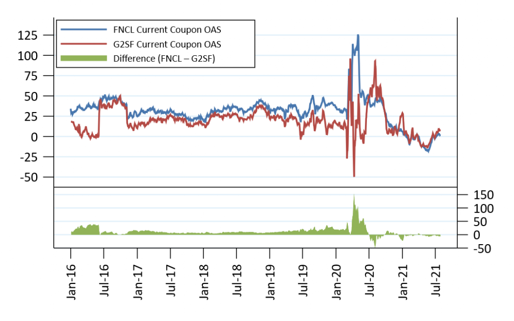 Ginnie Mae MBS have also been trading at an OAS close to the OAS for conventional MBS throughout the pandemic (Exhibit 3). Ginnie Mae MBS typically traded at a tighter OAS than conventional MBS prior to the pandemic, likely due to the full faith and credit government guarantee. It may be easier to structure deals backed by Ginnie Mae pools available at wider OAS, contributing to the growth of Ginnie Mae CMOs.