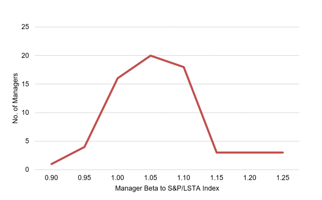 Note: Manager beta calculated based on active deals with at least 18 months of accurate data. Where no beta can be calculated, the analysis uses the average beta across each manager’s active deals weighted by the average deal principal. Results for managers with five or more active deals only.
