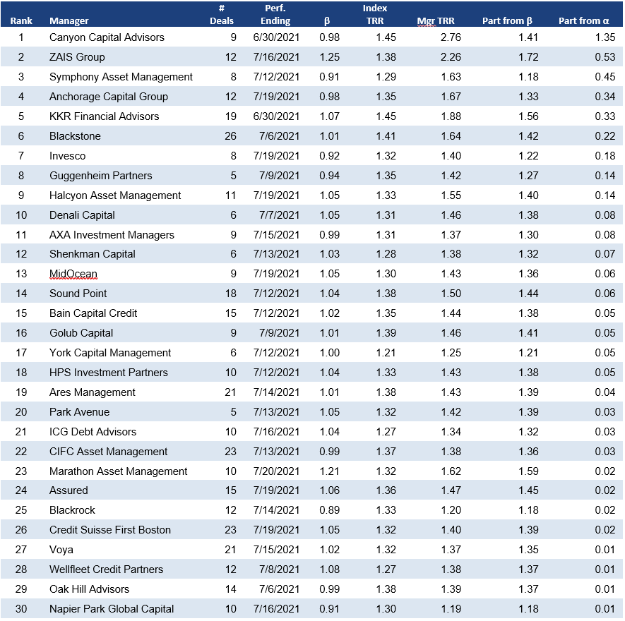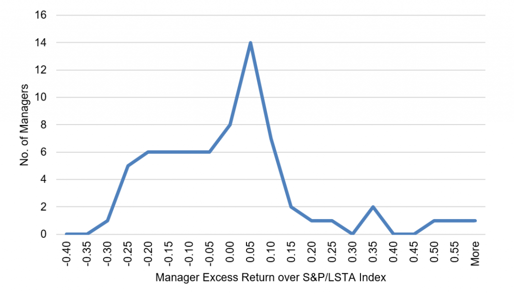 Note: Performance for managers with five or more deals tracked by APS. Performance attribution starts with calculated total return on the leveraged loan portfolio held in each CLO for the 3-month reporting period ending on the indicated date. CLOs, even with a single manager platform, may vary in reporting period. The analysis matches performance in each period to performance over the identical period in the S&P/LSTA Leveraged Loan Index. Where a deal has at least 18 months of performance history since pricing and no apparent errors in cash flow data, the analysis calculates a deal beta. The deal beta is multiplied by the index return to predict deal return attributable to broad market performance. Where no beta can be calculated, the analysis uses the average beta across each manager’s active deals weighted by the average deal principal
