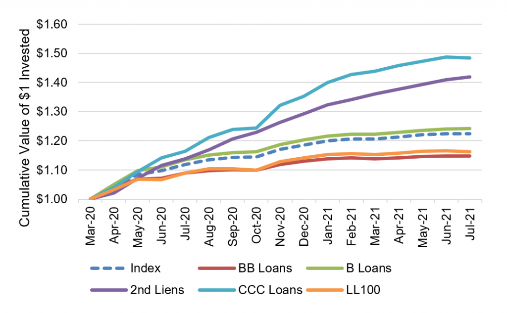 Managers have had to chase a market since March 2020 where taking risk has earned better returns than the index. The index through July has delivered a cumulative 22.5%, but returns have varied on either side depending on risk (Exhibit 2). ‘BB’ loans, which are safer than an index that now averages a ‘B’ credit, have returned a cumulative 14.7%. The 100 largest leveraged loans, which are more liquid than the average index loan, have returned a cumulative 16.3%. ‘B’ loans have generated a cumulative 24.1%, second liens a cumulative 41.9% and ‘CCC’ loans a cumulative 48.4%.