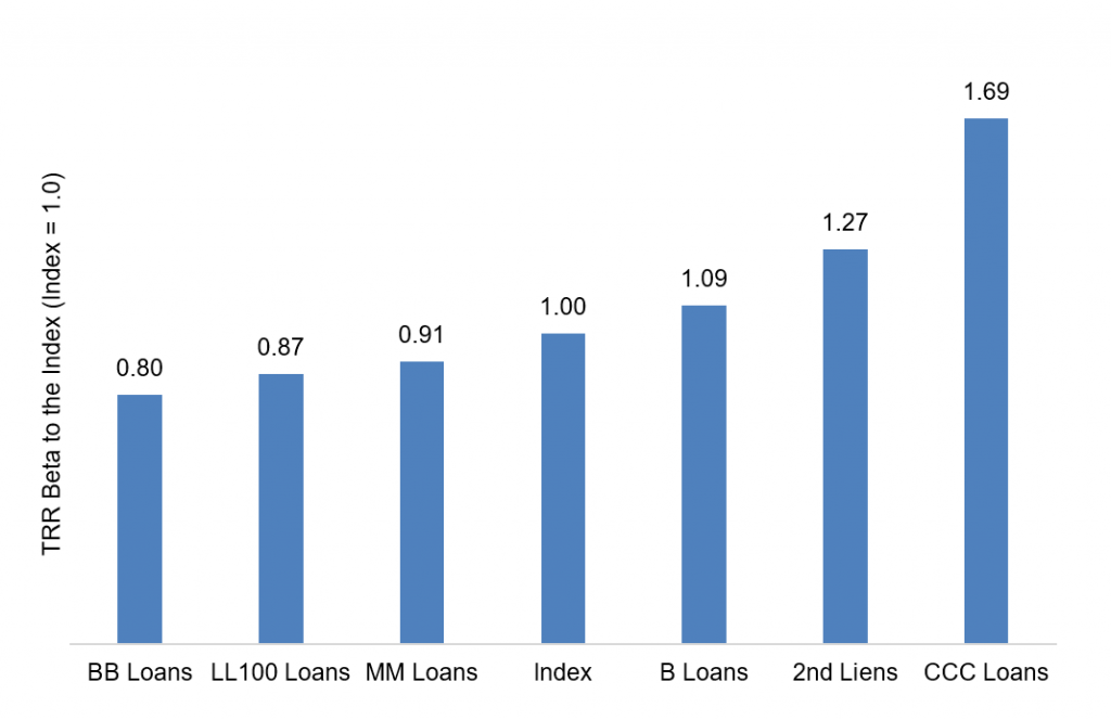Taking each portfolio of the type outlined and calculating beta against the S&P/LSTA Leveraged Loan Total Return Index recovers an intuitive ordering of risk (Exhibit 2):