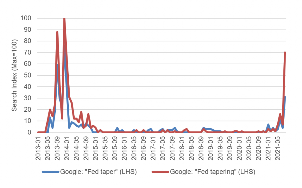 It is impossible to pinpoint exactly when markets start to price in tapering, but there are indications of when the idea gets louder in the public conversation. Google Trends tracking of searches for “Fed taper” or “Fed tapering” show awareness today approaching levels last seen when the Fed leaned into tapering in 2013 (Exhibit 1). That action reflects a steady beat of remarks about tapering starting in January from Fed bank presidents, Fed governors, occasionally the Fed chair and the bubbling up of the topic in FOMC minutes and press conferences through the summer. That action presumably includes more than just fixed income analysts reminding themselves of Fed history.