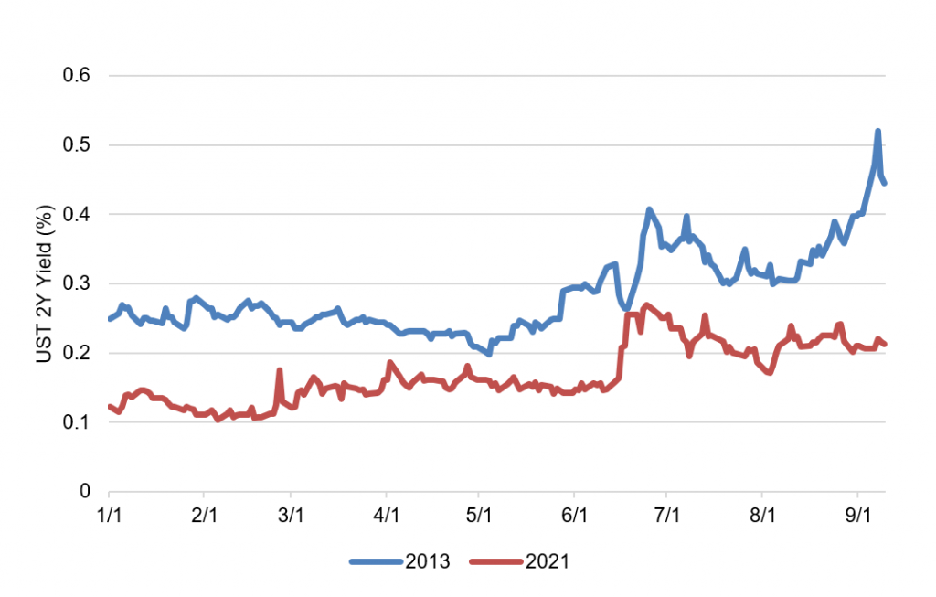 Exhibit 2: A more muted 2-year Treasury response to taper talk this year