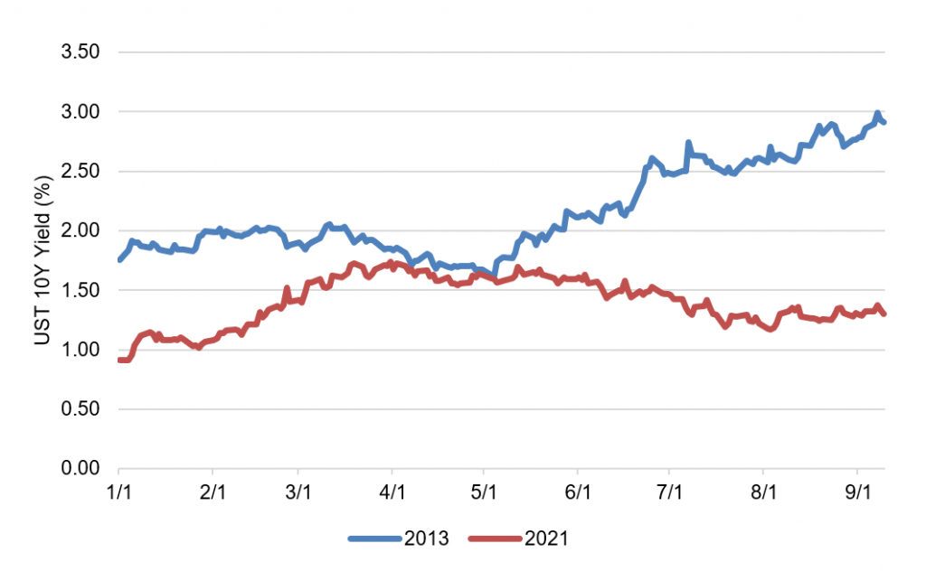 On the longer part of the yield curve, the difference in response across episodes of taper talk is striking. In both 2013 and 2021, 10-year Treasury yields in early May stood near 1.60% (Exhibit 3). By early September 2013, 10-year yields had risen to nearly 3.00%. Today, 10-year yields stand near 1.35%