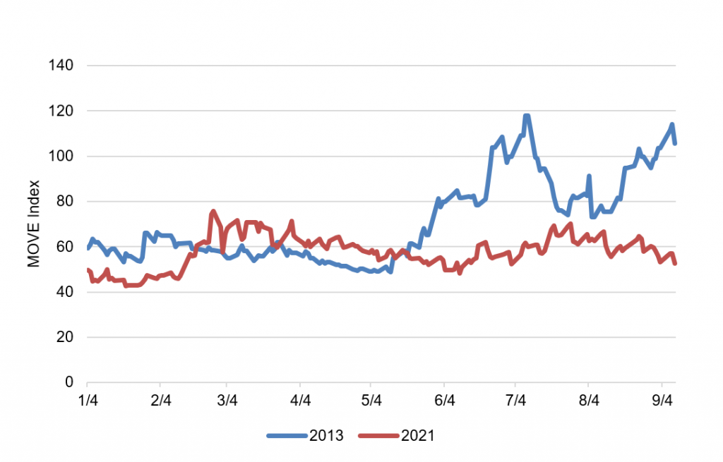 On the front end of the yield curve, the market move this year is much smaller than 2013. In both 2013 and 2021, discussion of tapering got louder around May and June. In both years, 2-year Treasury yields moved higher, reflecting a higher expected path for fed funds (Exhibit 2). But heading in September 2013, 2-year yields kept moving up. In 2021, they have moved little beyond their early summer response.