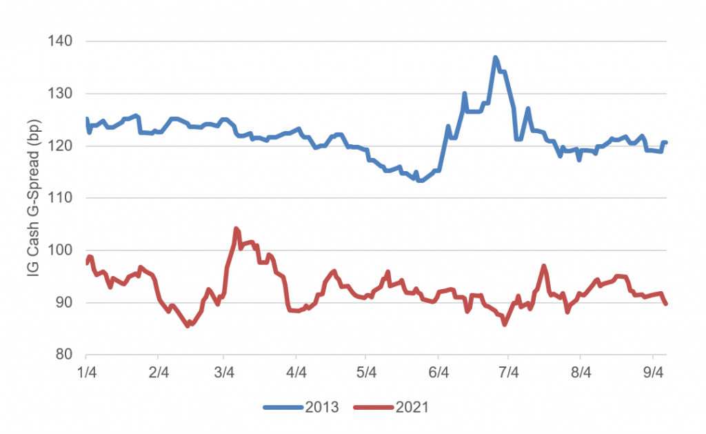 In investment grade corporate debt, the response to rising taper talk also has been relatively muted. There is a big difference in absolute IG spreads between 2013 and 2021, with spreads this year roughly 30 bp tighter (Exhibit 5). But from mid-May 2013, around the time Fed Chair Ben Bernanke famously tipped his hand to taper, to early July, corporate spreads widened more than 20 bp. In 2021, corporate spreads widened as interest rates rose through February, but they have since returned to pre-February levels and remained relatively steady.