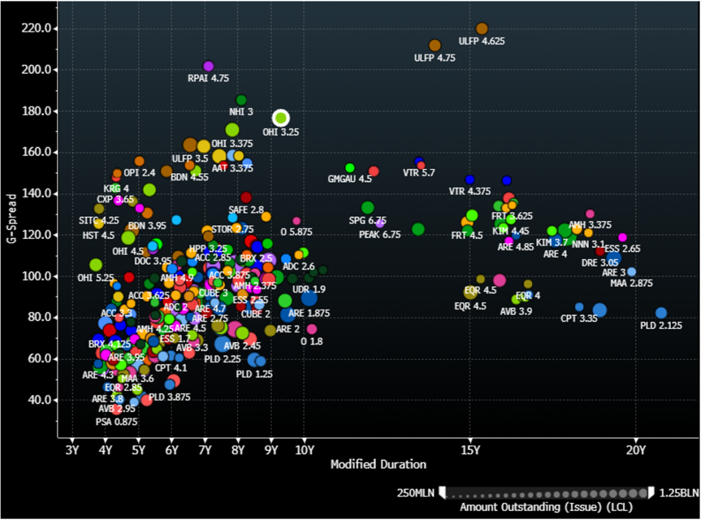 The OHI long 10-year bonds were issued as 12-year notes earlier this year. At a +174.5 g-spread and total yield north of 3%, the bonds represent one of the cheapest available in the broader REITs sector in the 10- to 12-year part of the curve (Exhibit 1).