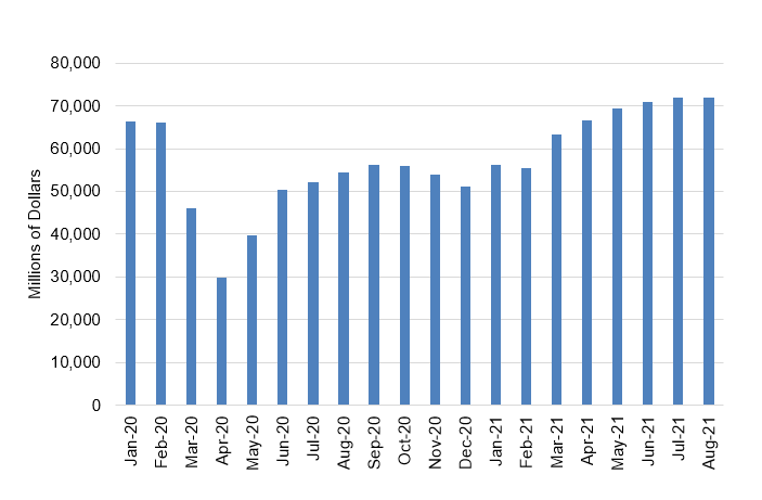 There was widespread speculation that the Delta wave led to a substantial pullback in restaurant spending along with other types of service activity in August and likely September as well. I have to admit that I had penciled in a modest decline for restaurant receipts in my own retail sales forecast (about 2%). However, as it turns out, the Census Bureau reported that restaurant receipts were roughly flat last month. While this is not a stellar outcome, especially given the pace of inflation in the sector in recent months, it was considerably better than expected.