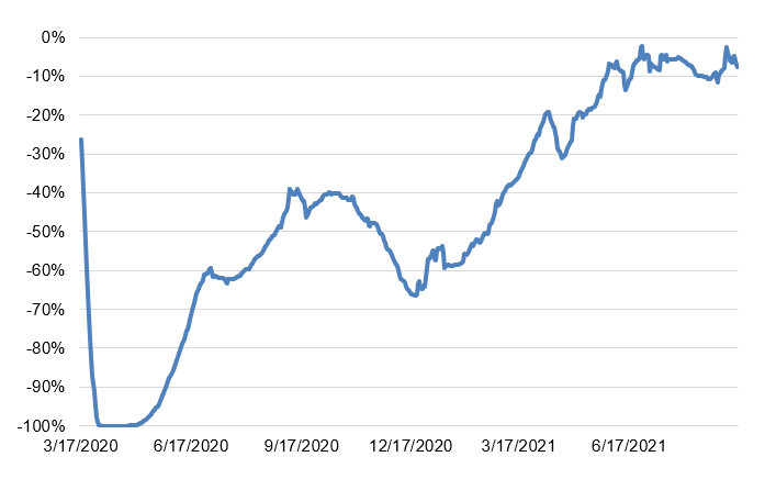The OpenTable show that after a sharp recovery in the spring and summer of 2020 as lockdowns eased, the winter Covid surge and perhaps weather less conducive to outdoor dining led to a sharp pullback in restaurant diners, taking the year-over-year decline from around 40% all the way down to almost 70%. In contrast, the dip seen in August 2021 was just a few percentage points. It is also worth pointing out that the largest daily two-year declines recently came during the week that Hurricane Ida tore through Louisiana and then flooded much of the Mid-Atlantic coastal region.