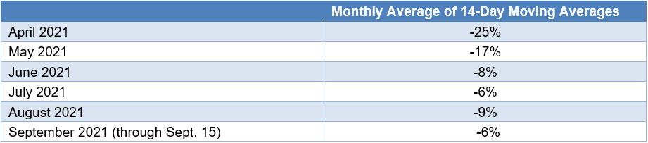 The OpenTable data offer good news for September as well. The average over the first half of the month has ticked back up to -6%, in line with the July average. Of course, this is not a particularly robust result, but if this is as bad as it gets during the Delta wave, then the economy should be in good shape moving forward. If the number of restaurant diners in the midst of the Delta wave is steady, then, as the virus ebbs, I would anticipate that sales would be in a position to swing noticeably higher in the fall.