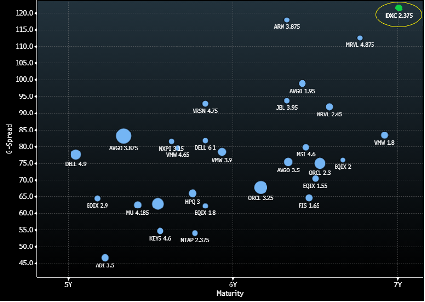 DXC Technology Company (DXC, Baa2/BBB-/BBB) has spent the past year reducing both costs and overall debt levels to preserve ratings and margins as it executes its turnaround strategy. Management has demonstrated good progress on its efforts over the past few quarters as bookings remain above 1.0x. As one of the widest trading credits in the technology space, DXC’s strong credit profile with net leverage below 1.0x provides for ratings stability as the company works to further stabilize the top line. Debt spreads could compress closer to similarly rated technology credits as margin expansion further improves its credit profile. A swap out of Marvel Technology (MRVL – Baa3/BBB-/BBB-) 2.45% 2028 bonds into DXC 2.375% 2028 notes provides for a pick-up of 30 bp (g-spread) while gaining a ratings notch at both Moody’s and Fitch.