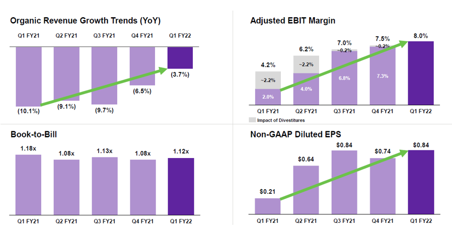 DXC’s most recent earnings highlighted how far management has come on its turnaround efforts as the company continues to post year-over-year improvement on revenue, margin and EPS trends. While DXC has struggled in the past to post sustainable organic revenue growth, it has made a dramatic improvement in the rate of decline. For the most recent quarter, DXC posted a 3.7% organic revenue decline which was a significant improvement from the 10.1% decline witnessed in the year ago-period. Management also reiterated guidance for the full fiscal year with organic revenues expected to be down in the 1%-2% range. Management believes it can achieve an organic growth rate in the 1%-3% range by March 2023.