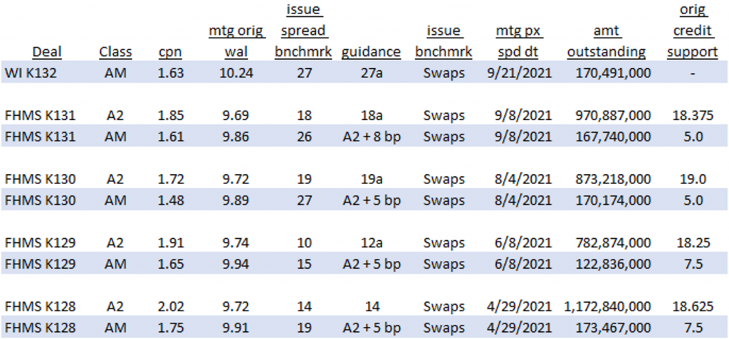 Under new leadership of Acting Director Sandra Thompson, the FHFA proposed on September 15, 2021 to amend the capital rule, in part to encourage the distribution of credit risk from the GSEs back to private investors. It’s unclear whether or not Freddie Mac will choose to issue mezzanine classes again in their K-series deals, or what the impact would be on the AM class. The new WI program is linked to the AM class and functions as a pass-through for AM bonds if investors choose not to exchange their certificates. Given the relatively small size of the AM class, Freddie anticipates that over time new AM bonds will only be available to investors through the WI K-Deal program.