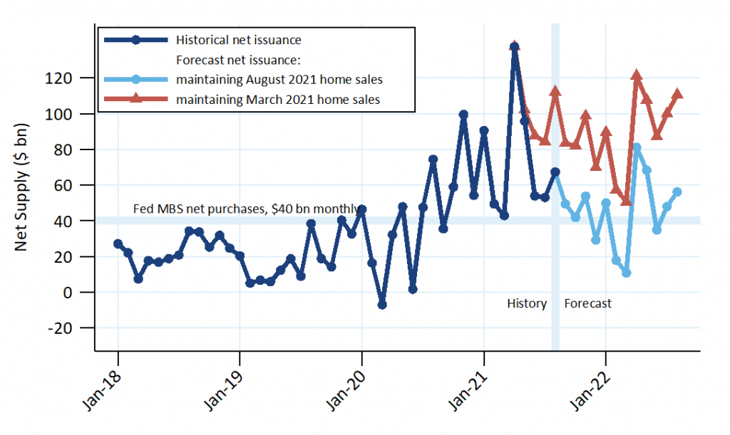 Through most of the pandemic, the Fed and banks have combined to absorb all net MBS supply along with MBS sold by other investors. But the Fed is likely to start tapering MBS purchases this year and bank demand could slow at the same time. Other investors would likely demand wider spreads to pick up the slack. But slowing home sales has pulled net monthly MBS supply down, which should reduce the pressure on spreads when the Fed tapers.
