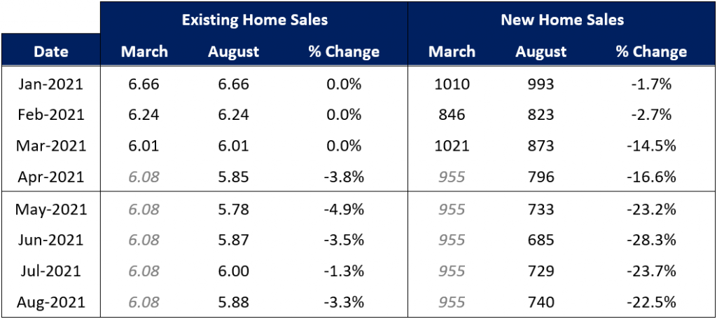 Gray italicized data from 5/12/2021 are projections using the consensus forecast reporting by Bloomberg at that time. The 9/30/2021 column includes revisions for January through March, and actual home sales from April through October.