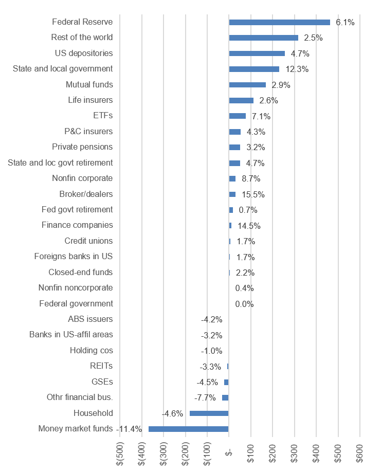 Note: Data labels show QoQ % growth. Z.1 Table L.208 discloses unatrributed changes in debt security balances of ($513) billion not shown.
