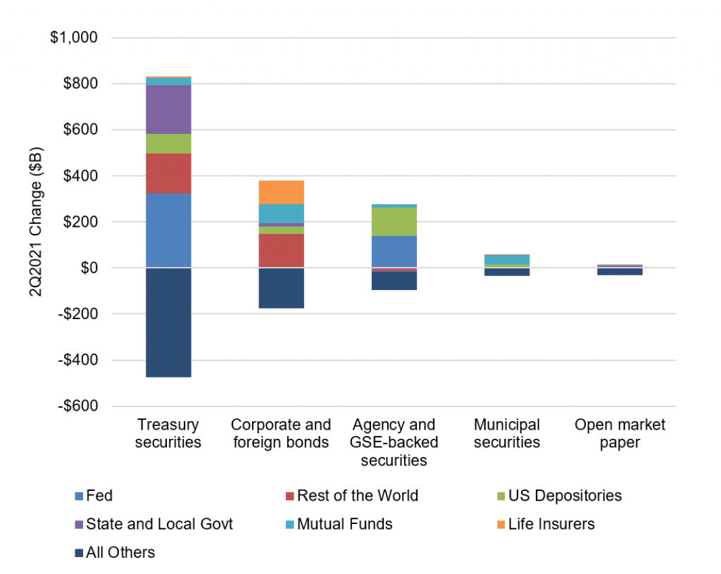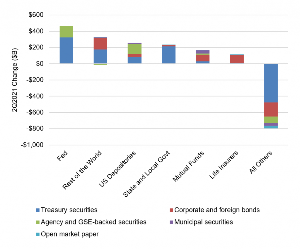Despite relatively low rates and tight spreads, demand for paper in the second quarter completely outstripped supply. Portfolios that grew—from the Fed’s $463 billion in growth to nonfinancial noncorporates’ $300 million—added nearly $1.9 trillion in new holdings (Exhibit 2). With only $747 billion in new securities available, other investors had to sell more than $1.1 trillion to satisfy the demand.