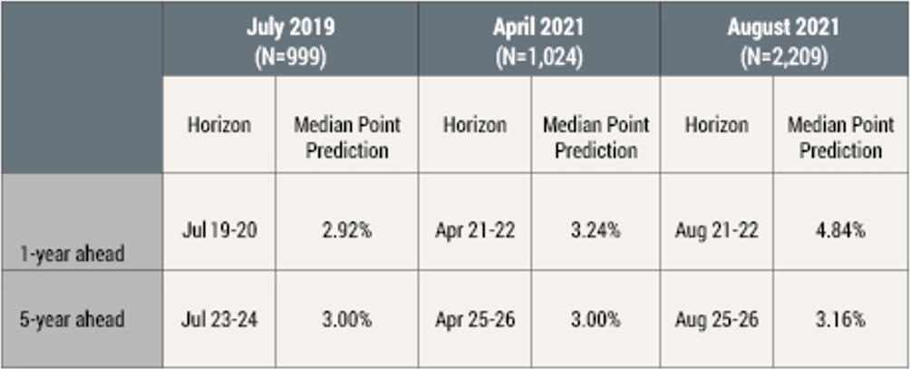 Researchers at the New York Fed recently published a piece taking a more detailed examination of the bank’s consumer survey results for inflation expectations. As it turns out, the New York Fed’s Survey of Consumer Expectations includes, in addition to the regular monthly questionnaire, periodic special surveys that ask supplemental questions. The bank’s research staff has additional unpublished data on inflation expectations that are examined in the New York Fed research paper. In particular, there were three special surveys, in July 2019, April 2021 and August 2021 that asked respondents to provide inflation expectations for the 1-year period four years ahead. So, for example, in the August 2021 survey, consumers would have been asked to predict inflation for the period between August 2025 and August 2026. The paper shows that while 1-year inflation expectations have shot up from about 3% before the pandemic to almost 5% by August of this year, the median expectation for inflation in Year 5 have barely crept higher.