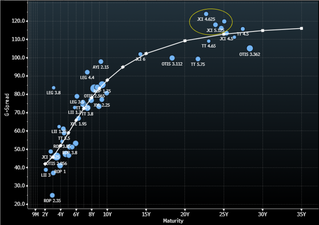 JCI (Baa2/BBB+) is market leader in the evolution of smart, healthy and connected buildings, a need that grew exponentially due to the pandemic. A broad synergistic portfolio which encompasses HVAC, controls, fire and security has enabled JCI to address building needs globally. JCI has demonstrated their leadership in ESG sustainable solutions as companies look to reduce their carbon footprints while operating healthy buildings post-pandemic. Company management believes these two factors present a $250 billion market opportunity over the next decade, which is expected to provide for meaningful top line growth. JCI’s curve remains one of the steepest versus peers such as Otis Worldwide Corporation (OTIS – Baa2/BBB) and Trane Technologies (TT – Baa2/BBB), despite being rated one notch higher at S&P and having the best long-term growth prospects. Relative value investors should move into JCI’s long dated bonds as its curve is likely to compress closer to peers.