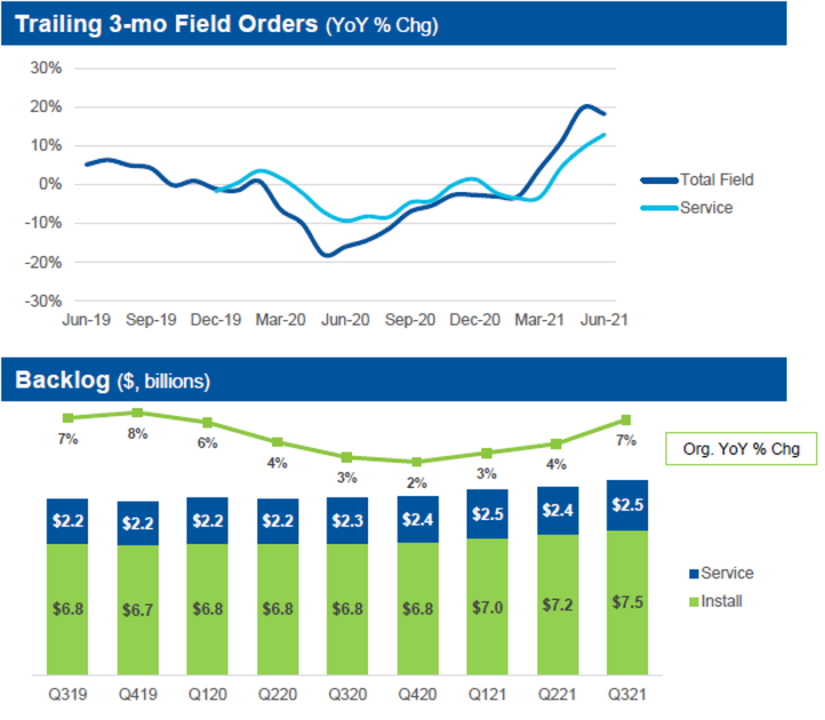 End markets have continued to improve since 2020 and order growth has accelerated largely driven by retrofit demand. New construction is beginning to recover, but those projects tend to be longer in nature and demand is really in short cycle projects. JCI reported in the most recent quarter that field orders were up 18% year-over-year, while service orders were up 13% and install orders were accelerating at 23%. This has led to a record backlog of $10 billion, which is up 7% year-over-year on an organic basis, with roughly 75% of the backlog related to install base orders. JCI noted that retrofit or smaller turn projects in North America were up 30% year-over-year which has been a big driver of their install business. Looking to 4Q, management does not expect to witness any slowdown in order growth.