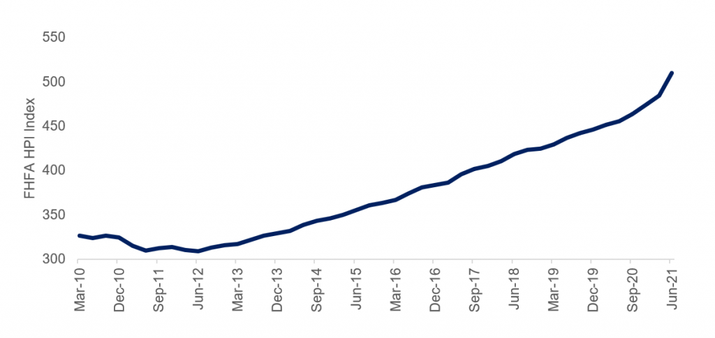 As of June, FHFA’s Home Price Index was up roughly 12% over the prior June reading. A more recent CoreLogic reading has home values up 18.1% year-over-year through August. Assuming FHFA’s measurement is roughly in-line with Core Logic estimates, conforming and jumbo conforming loan balances could rise close to 20% next year. An 19% increase in balances would push the conforming limit next year to nearly $650,000 and the limit for high-cost areas, which is 150% of the conforming balance, to nearly $1 million.
