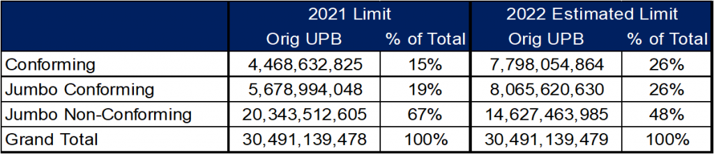 Note: Data show prime jumbo private-label securitizations YTD for 2021. The “2021 Limit” shows the current mix. The “2022 Estimated Limit” shows the mix that would prevail if projected higher agency loan limits applied to 2021 YTD production.