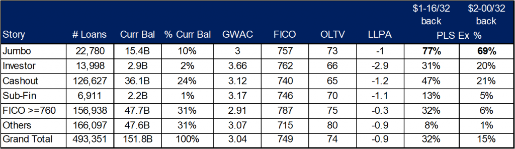 Recently spreads across lower coupon conforming jumbo specified pools have tightened dramatically against TBA benchmarks, driven by a lack of supply as originators are likely holding back production to deliver into higher limits for forward delivery next year. And as a result, GSE execution may be moderately better than the analysis may suggest. However, as the supply technical abates, spreads on conforming jumbo pools should widen back out, and if they do, many conforming jumbo loans may still achieve better prices by being sold to private-label conduits.