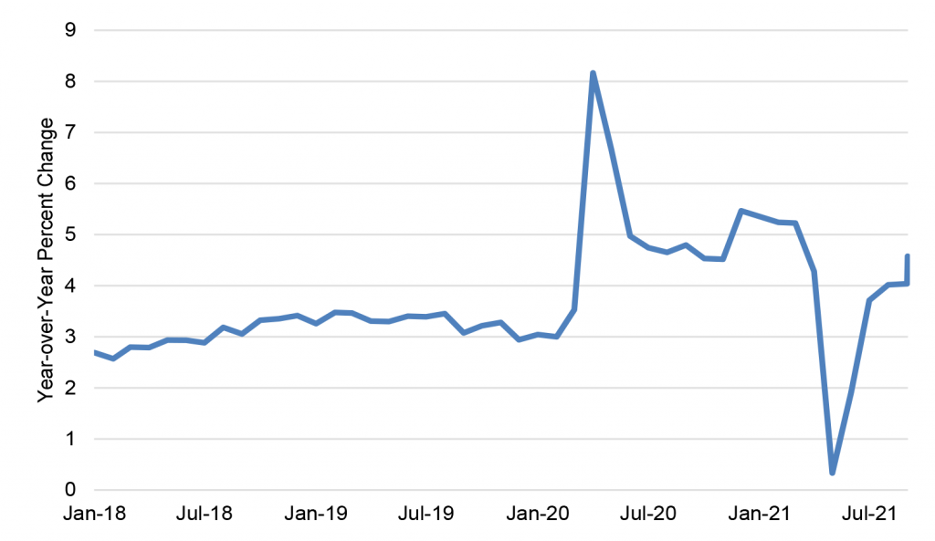 One of the main Fed arguments for expecting transitory inflation was the narrow run-up in prices earlier this year. In fact, Chair Powell’s Jackson Hole speech in August made this the first of his five arguments for a benign inflation outlook. Unfortunately, the breadth of price pressures has increased substantially in the past few months, adding to the upside risk for inflation. A similar dynamic appears to be occurring with wages as well.