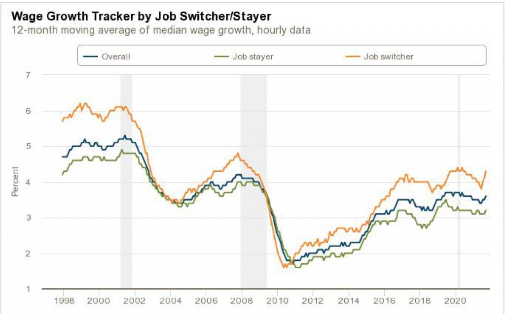 The Atlanta Fed researchers further break down their dataset. One interesting subdivision that they report is wage changes for job switchers and job stayers. Empirically, we know that the bulk of wage changes tend to occur when workers move to a different job. The Atlanta Fed data confirm that this hypothesis applies to the current situation (Exhibit 4).
