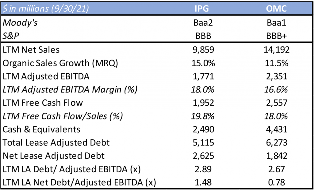 For the nine months ended 9/30/21, IPG’s organic growth rate was 12%, with double-digit organic growth in all geographic markets. While IPG’s credit metrics are slightly weaker than those of OMC, as evidenced in Exhibit 1, we note that IPG repaid $500 million of debt after quarter end with cash on hand. That said, IPG’s total lease adjusted leverage is now 2.6x and just slightly lower than that of OMC.