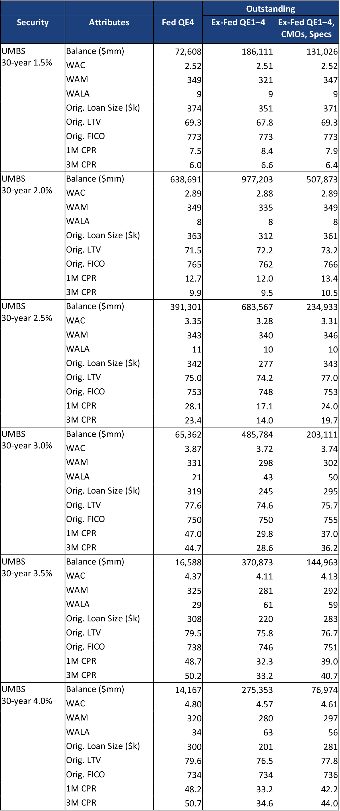 The final column in the table shows the float—it removes specified pools and pools locked into CMOs. The Fed’s pools look like the float in the coupons that were heavily produced while the Fed was buying. For example, the gross WACs and loan sizes are similar in the 1.5% through 2.5% coupons. But in the 3.0% and higher coupons the Fed took delivery of less seasoned pools with worse characteristics than the float. For example, the Fed’s 3.5% pools are 24 bp higher gross WAC, 30 months less seasoned, and $25,000 larger original loan size than the float in that coupon. And the Fed’s pools have been prepaying faster than the float in all coupons 2.5% and greater.