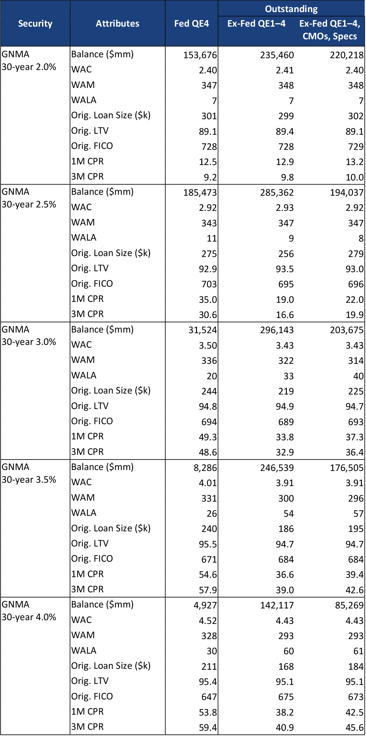 The picture is similar in Ginnie Mae MBS (Exhibit 2). The pools the Fed owns look very similar to the non-specified pools owned by the private investors. The Fed has bought 40% to 50% of all generic pools in the 2.0% and 2.5% coupons, removing a lot of negative convexity from the market. Few specified pools have been created in the 2.0% coupon so there isn’t much difference between the Fed’s holdings and the float. The Fed’s pools also look like the float in the 2.5% coupon but have a higher loan size than the float. Like conventional 30-year pools, in the 3.0% and higher coupons the Fed took delivery of pools with worse characteristics than the float—higher gross WAC, loan size, and lower seasoning. In all but 2.0%s, the Fed’s pools have prepaid faster than the cohort.