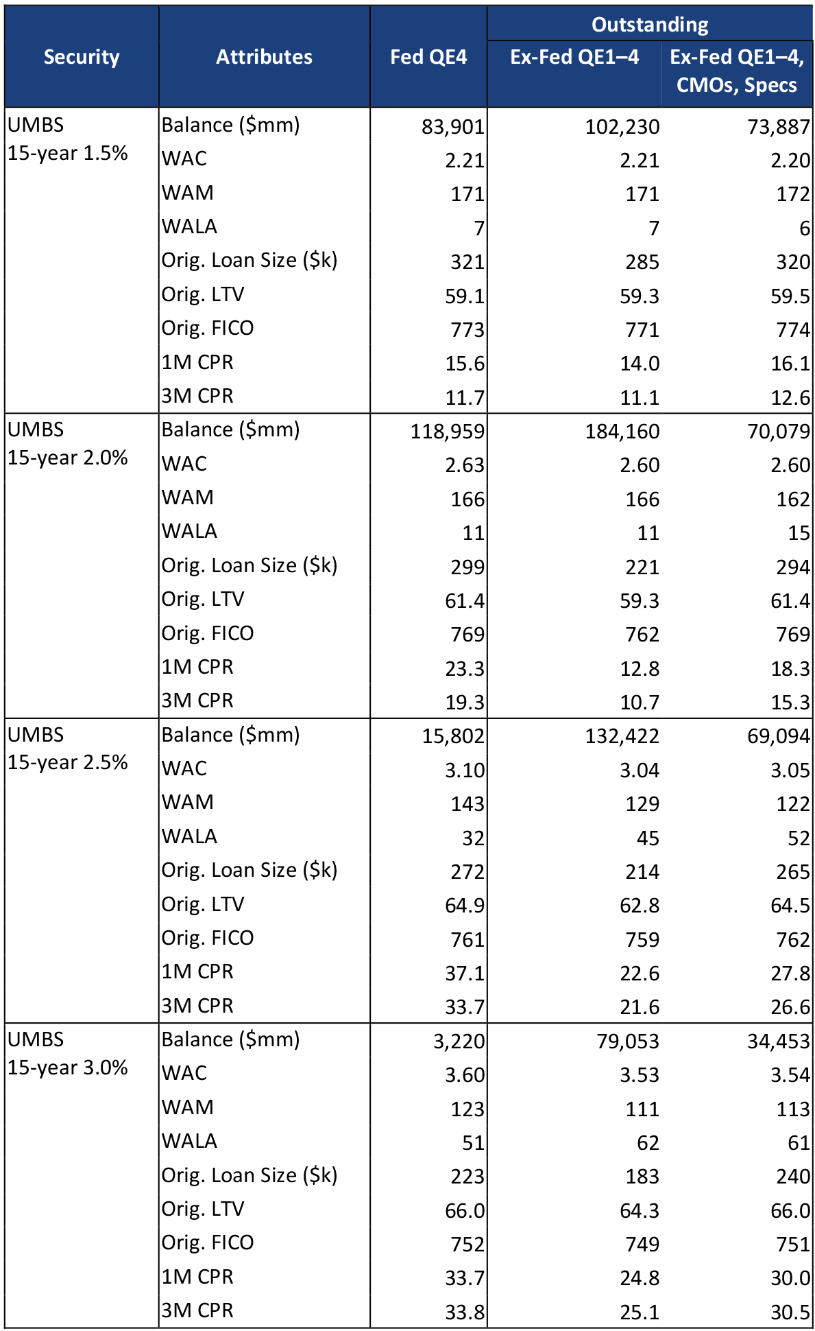 The Fed also owns a large share of the generic 15-year UMBS pools issued during the pandemic (Exhibit 3). The Fed owns 53% of generic 1.5%s and 63% of generic 2%s. The Fed pools have similar characteristics as the float, albeit with greater seasoning in the 2% and higher coupons. The Fed’s pools are generally prepaying faster than the float, indicating they have worse convexity that may not be apparent from the collateral characteristics.