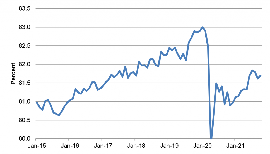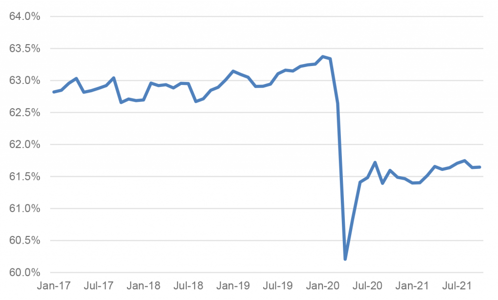Exhibit 1: The labor force participation rate has not yet recovered from pandemic