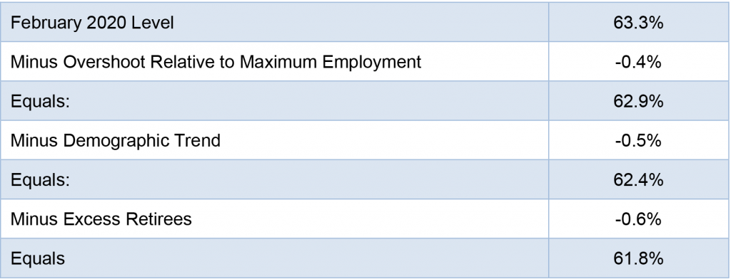 That number should probably be thought of as an upper bound on the impact of Covid retirements on labor force participation.  Some of those people could in theory be enticed back to work under the right circumstances, though retirees typically have a very low propensity to return to work once they have made the decision to step away. In addition, many of the people who retired at the age of, say, 62 or 63 last year would have been retiring anyway in a few years’ time.  Many of the excess retirees during Covid simply brought forward retirements that were going to eventually happen anyway.  That means that the “excess retirements” relative to the pre-pandemic trend should erode over the next several years.  Still, even if we assume for now that the excess number of near-retirement-age workers who have permanently left the labor force due to Covid is 1.5 million, half of the 3 million estimated by the St. Louis Fed economist, that would be worth about six tenths of a percentage point on the LFPR.