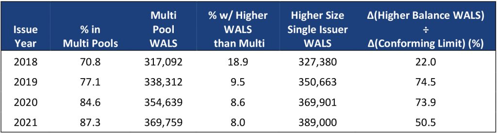 Population includes all non-specified pools. Multi pools include cash window and Major/swap pools. WALS is weighted average loan size. Higher balance pools are pools issued with a weighted average loan size greater than the multi pool weighted average loan size issued with the same coupon that month. The final column compares the increase in average loan size to the increase in conforming limit.